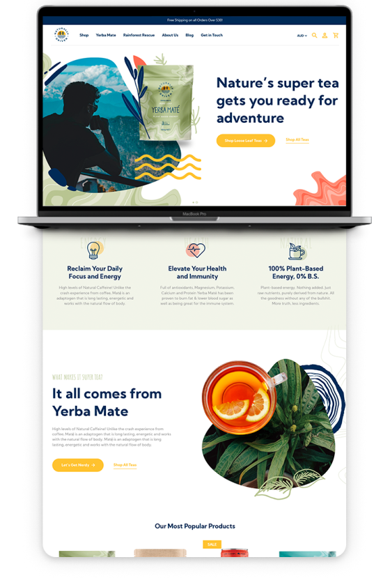 Our solution was to create a visually appealing and user-friendly design that highlighted the unique health benefits of their organic Yerba Mate tea. We incorporated engaging graphics and images to showcase the brand's commitment to sustainability and their mission to support rainforest regeneration. We also created a seamless user experience by improving the site's navigation and checkout process, which resulted in a significant increase in conversion rates.